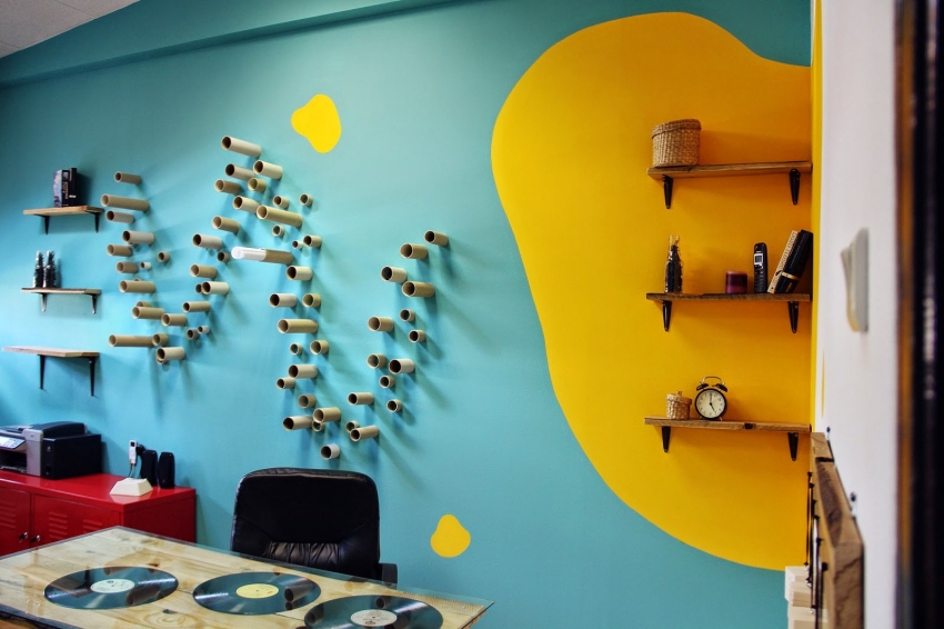 The simplest option for wall decoration is to apply a large number of horizontal or randomly spaced stripes, as well as geometric patterns. Multi-colored stripes or shapes can be obtained using masking tape.