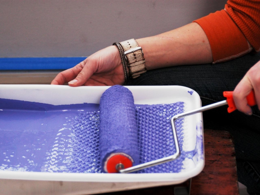 For easy application, pour the dye into the tray. The roller should be equipped with a handle of the required length to be able to paint the wall all the way to the ceiling. A plastic pipe or wooden stick is suitable for this. It is better to start the staining process from the corner. The corner area of the room is worked out with a brush, and then a roller is used.