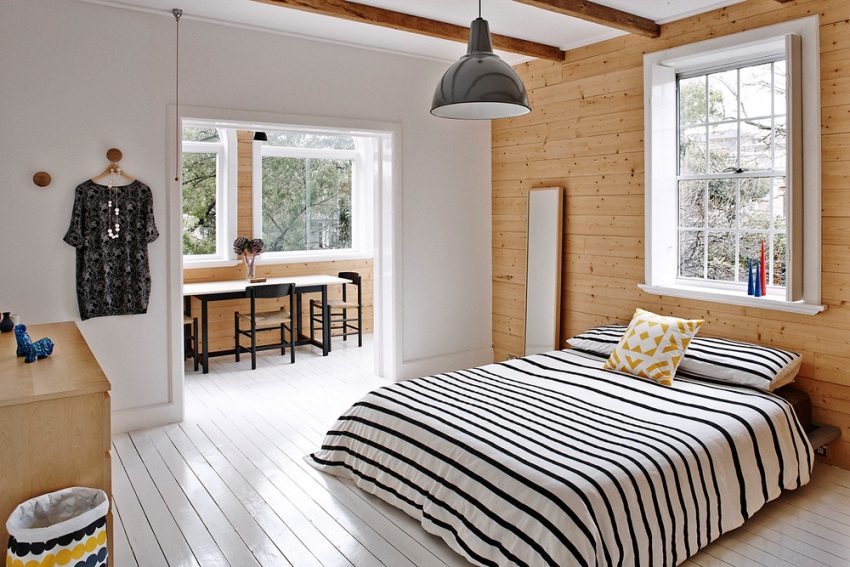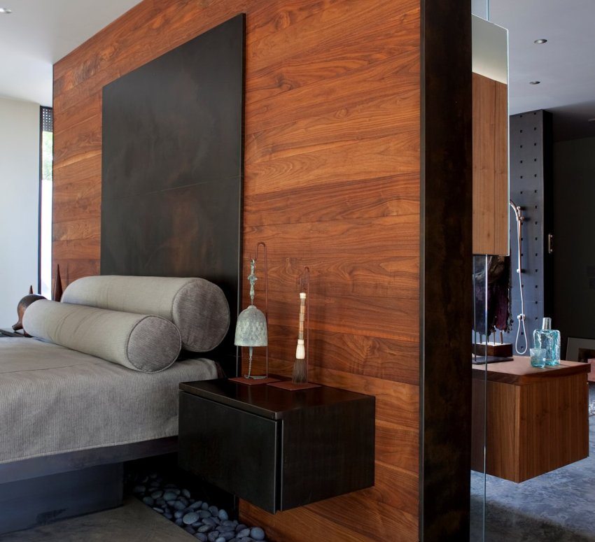 The laminate on the wall in the interior looks very excellent in this room. Photos of the most interesting options indicate that in bedroom it is customary to finish the surface of the wall, which is located behind the head of a large bed. The panels are selected exactly according to the color of the furniture. The result is the impression of a single headset. On the wall finished with laminate, you can also fix various shelves and accessories that bring comfort and life to any interior.