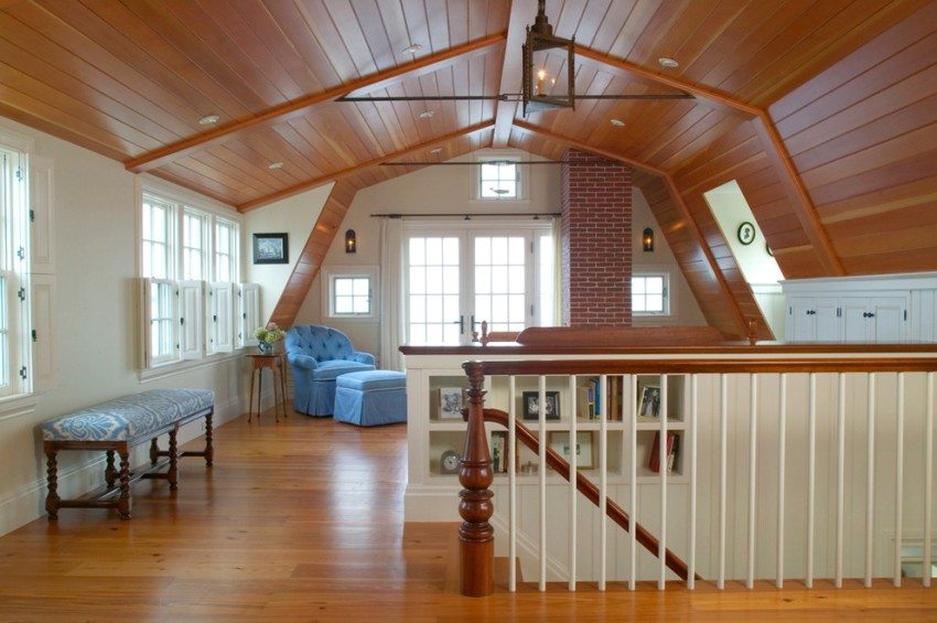 The attic looks great with a laminate on the wall in the interior. Photo, finished with this material attic floorsindicate that designers prefer to mount panels in these spacious rooms not only on walls, but also on sloped ceilings, and in different directions. For finishing country house the laminate fits perfectly. After all, its woody texture emphasizes closeness to nature and creates an atmosphere of warmth and comfort in this suburban island of comfort.