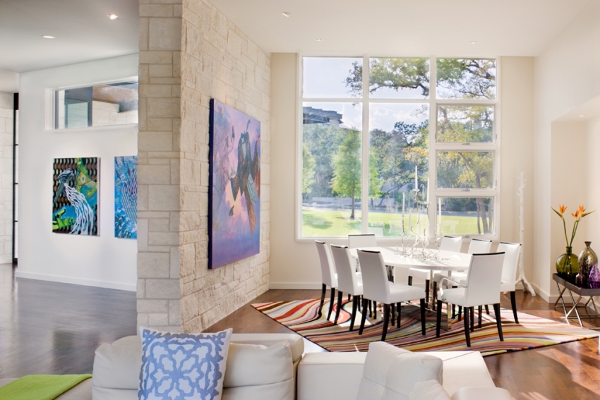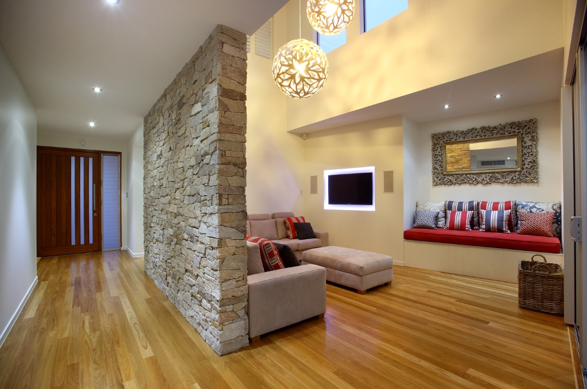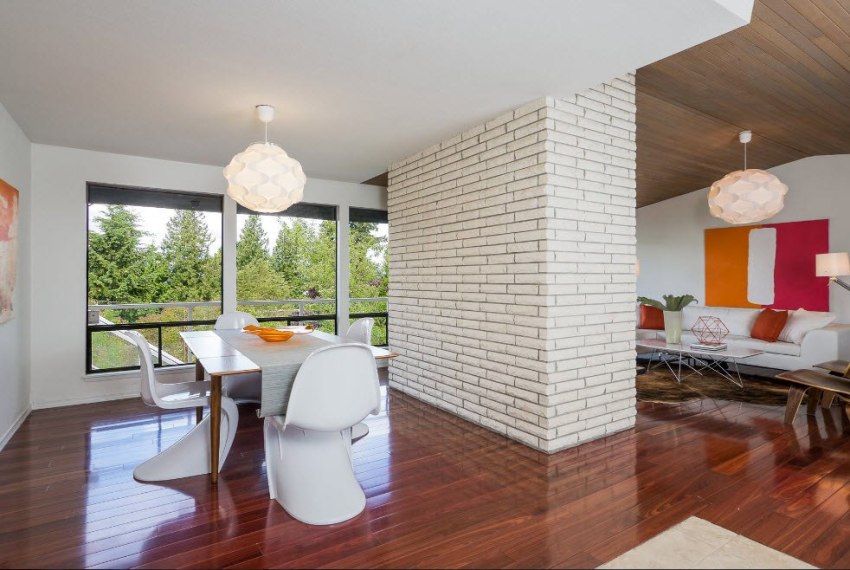 The brick interior partition is quite durable, so any shelves and other necessary decorative elements can be attached to it