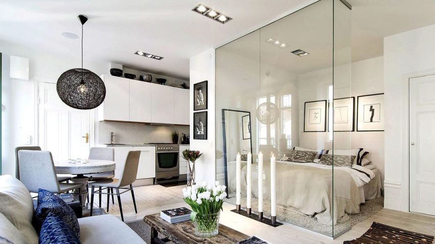 Examples of using. Zoning of studio apartments. Expansion of space, filling the room with light.