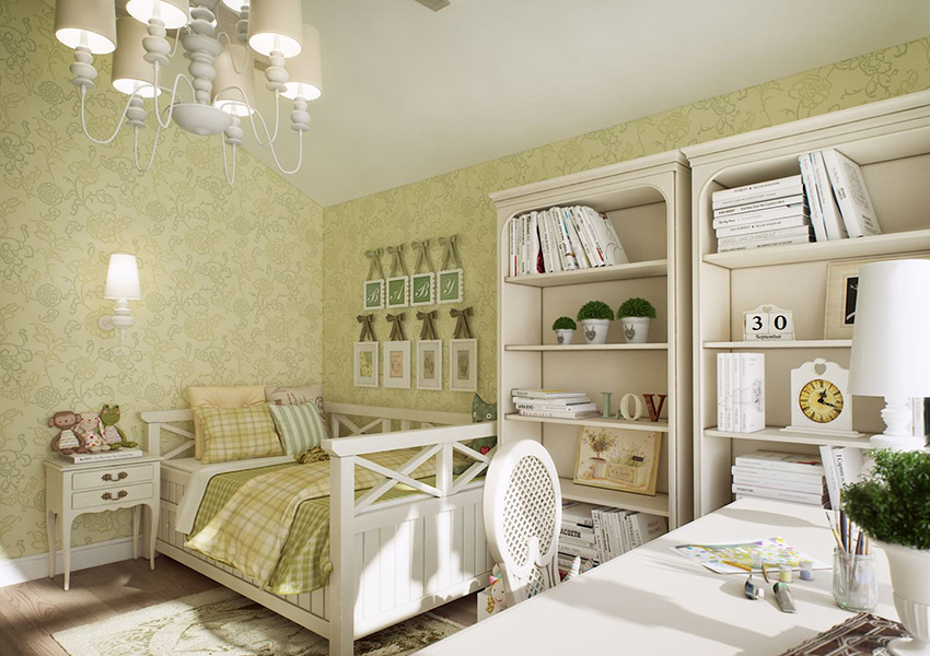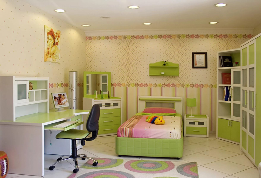 When choosing wallpaper for a girl, it is advisable to give preference to mint or emerald color. These shades have a calming effect on the child, relax him and have a positive effect on vision. Green wallpaper creates an atmosphere of warmth, security and comfort in the room.
