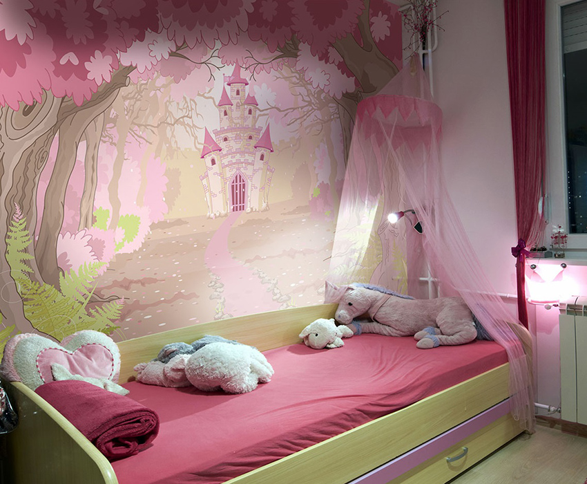 Using photo wallpaper in a children's room for a girl will create a special, completely unique design. The child can independently choose an image, which is subsequently applied to the canvas using high-tech printing. This is the advantage of this finish.