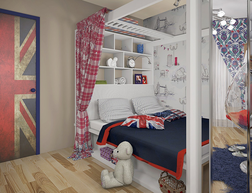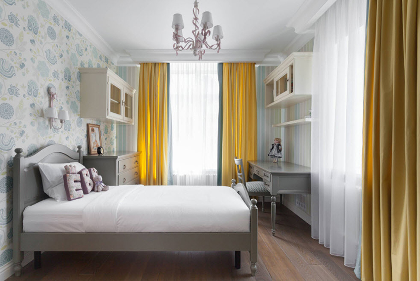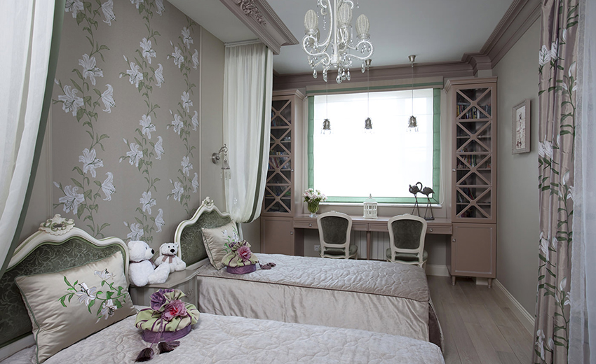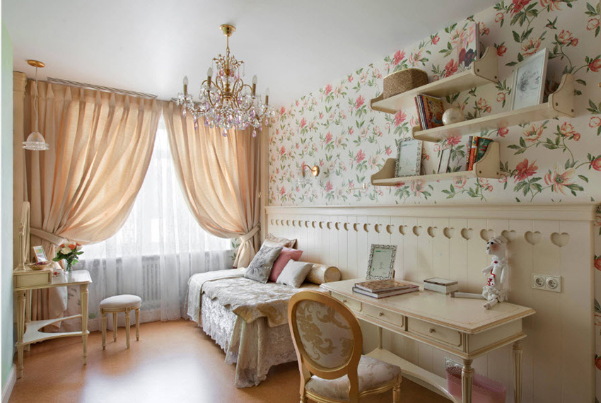 English style considered pretentious. The British are very dedicated to their traditions, which can be clearly seen in their interiors. But this does not mean that only wallpaper for a teenage room can be made in this style; for girls of younger ages, such a design is not taboo. The bedroom of a young lady can be safely decorated with the help of textiles, filling the interior with pillows, decorating it with bedspreads and beautiful curtains.