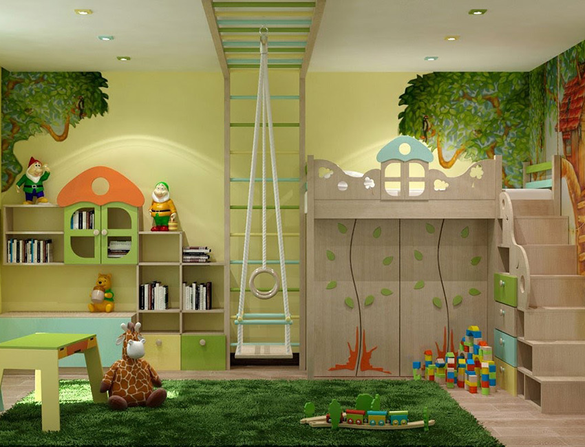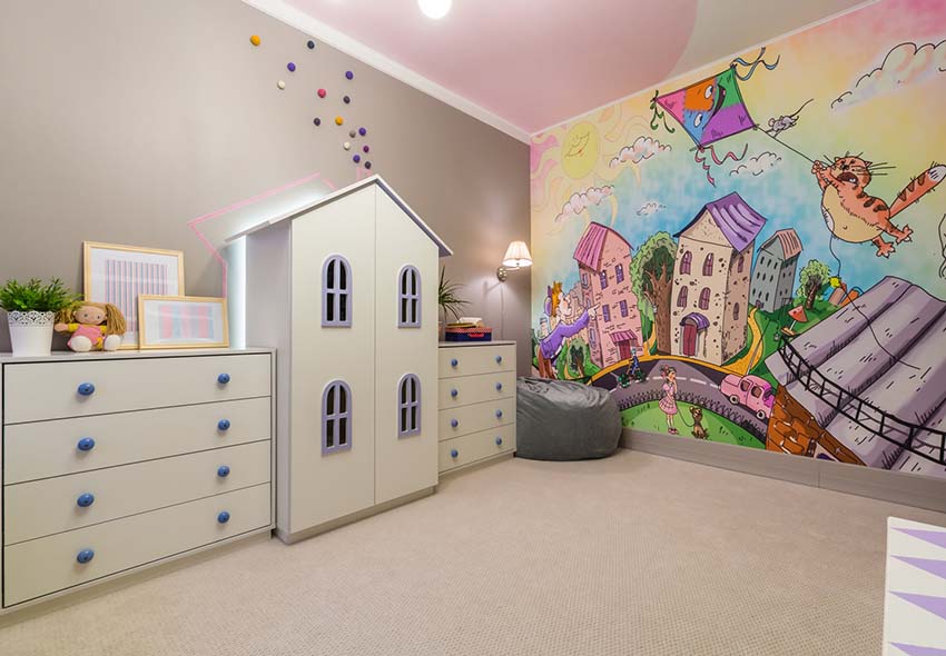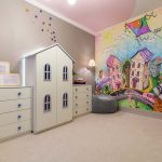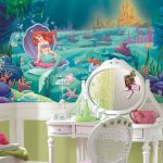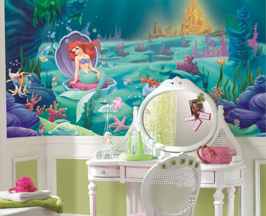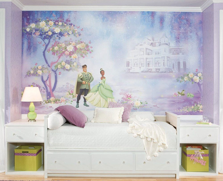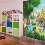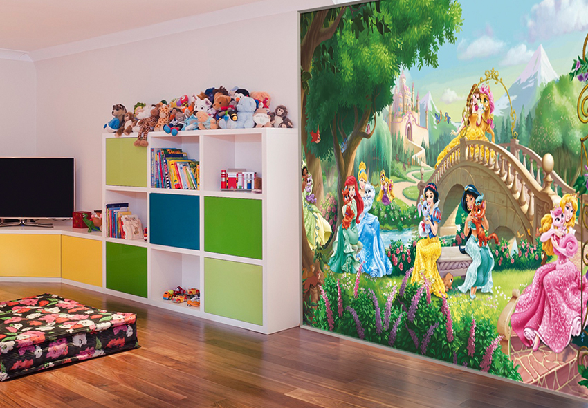 Wall murals are used locally in the interior. They are combined with restrained design finishes, so that the picture stands out favorably against the general background of the room. Most often, the play area is decorated with photo wallpaper. If the nursery belongs to a little girl, you can choose pictures with fairy tales, for example, characters from Disney cartoons, Barbie dolls, princesses, etc.