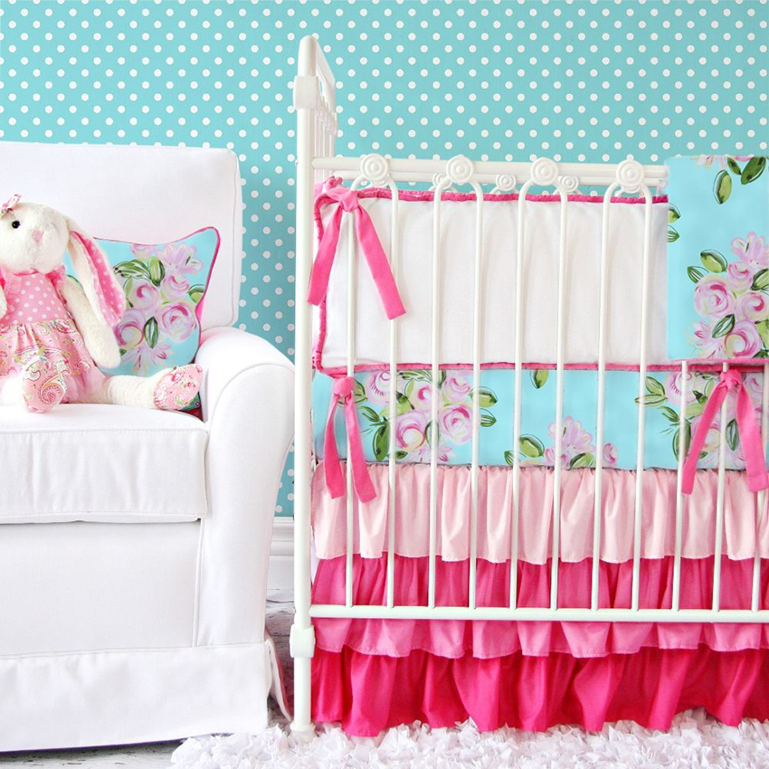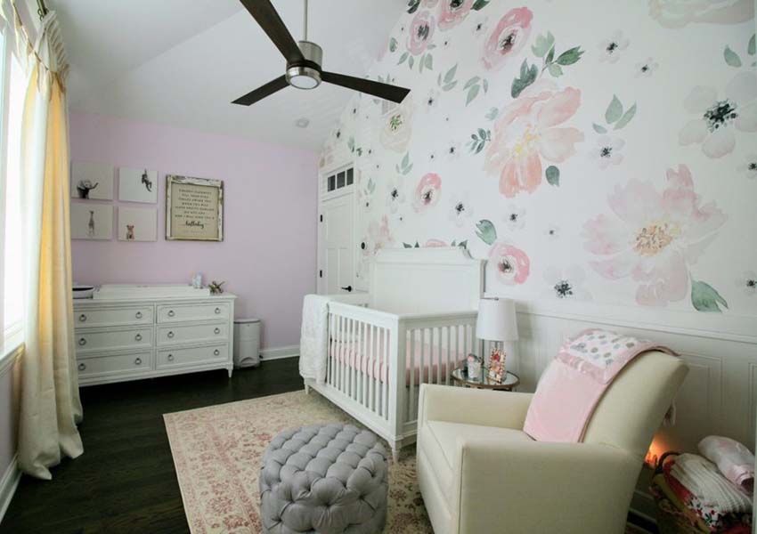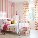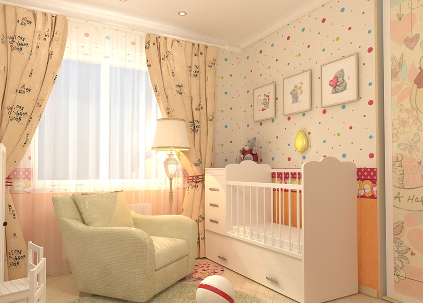 It is better to give preference to pastel or soft tones of a warm palette as the main color scheme. If the pattern on curtains and pillows are not too bright, you can buy baby wallpapers for girls with a similar pattern.