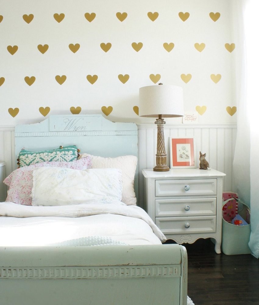 Wallpapers decorated with hearts will appeal to little ladies. Many girls like this drawing, but use it with care. Hearts quickly become boring and boring, so it is advisable to use them locally. In this case, most of the walls should be decorated with neutral monochromatic wallpaper.