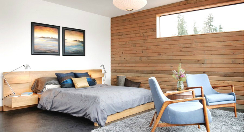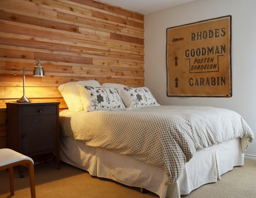 Accessories and décor play an important role in the design of the restroom. Some people cannot decide which curtains are suitable for gray wallpaper, photos of such interiors are very common on the net. Regardless of the shade of the finish, experts recommend repeating the color scheme of the wood-like wallpaper in other furnishing elements, for example, in curtains, furniture, bedspreads, and carpets. As a result, you can achieve unity in the design of the bedroom. In this room, as in the living room, the method of focusing attention on one of the walls is most often used. For this, photo wallpaper is used, decorating the surface behind the headboard in the form of a panel.
