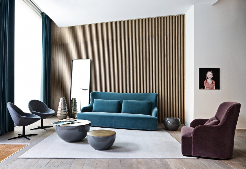 To create a living room interior, you can use photo wallpaper with the image of old boards or tree bark in a continuous canvas. It is allowed to use compositions consisting of various types of wood. In order for the accent wall to look as advantageous as possible, such a coating should be well lit. For the living room, wallpapers that imitate boards of unusual colors, for example, orange, blue, turquoise, are suitable.