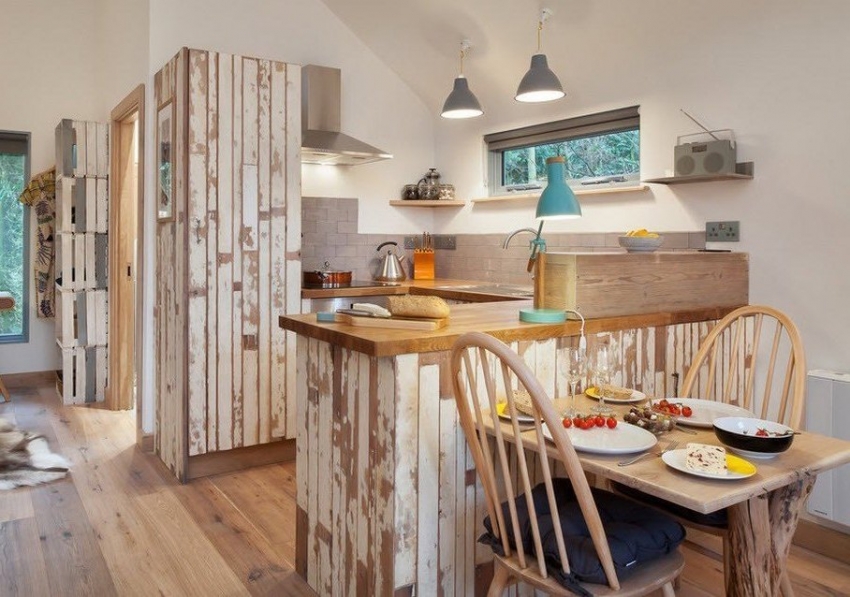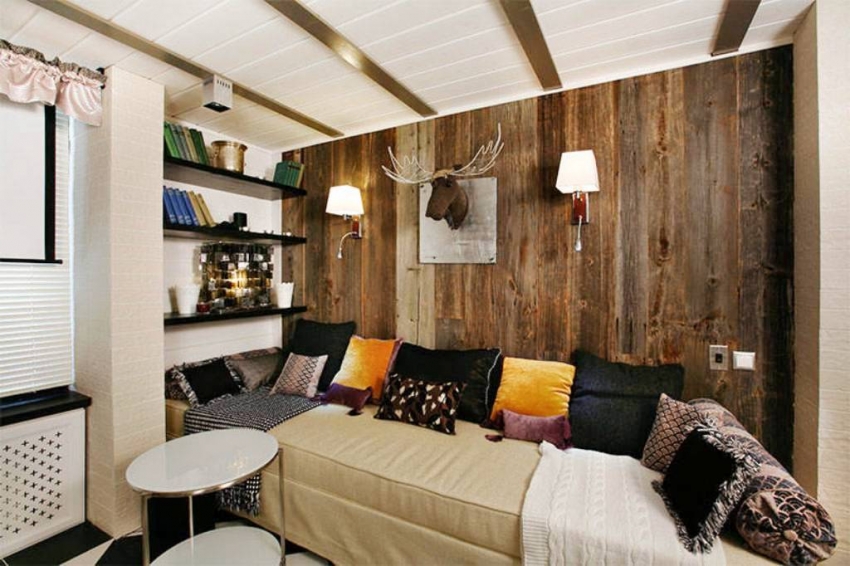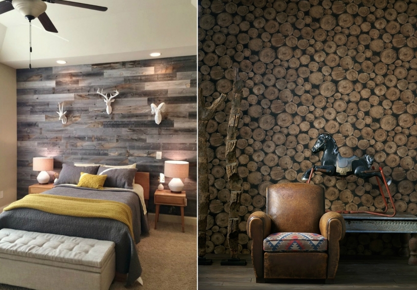 For interior decoration in light shades, you can use wallpaper with both the effect of a faded board and a contrasting log oak or mahogany