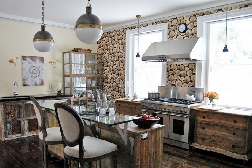 In the kitchen, the working area is usually decorated with such wallpaper, where a combination of small details will look most advantageous. For this room, it is recommended to select non-woven coverings. It is desirable that the shade of the furniture be in harmony with the color of the wall decoration. For the dining room, murals with imitation of wooden boards in dark or light tones or with images of forest landscapes are suitable.
