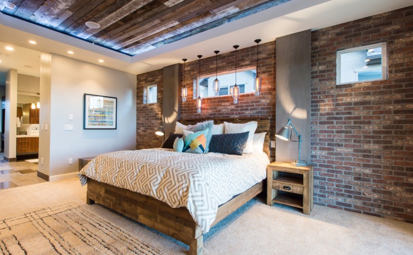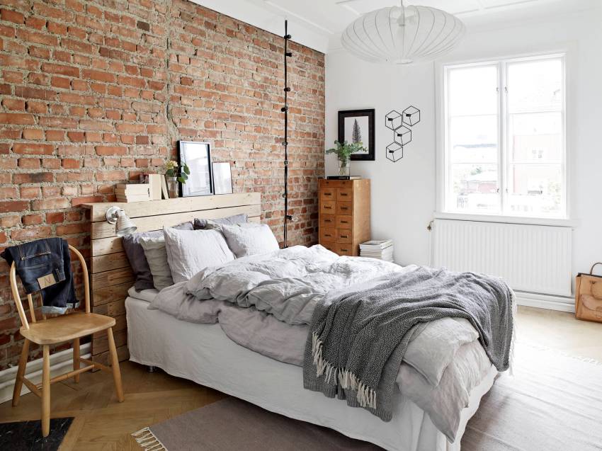 The method of accentuating one wall with a white brick wall can be used in the bedroom as well. These wallpapers are glued to the surface behind the headboard. Finishing in the form of imitation of brick from the side opposite to the sleeping place or by the window is allowed. Translucent curtains, a skin on the floor or a warm carpet, bright pillows on the bed are suitable as a decorative addition.