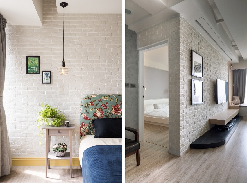 The use of white brick wallpaper in the interior of the living room and bedroom