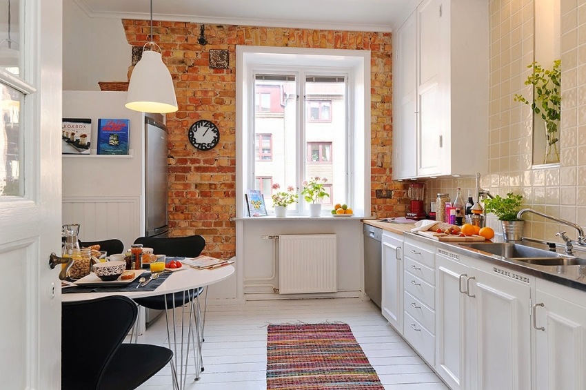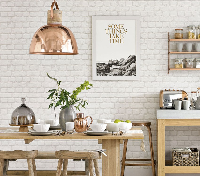 In the kitchen, an imitation of decorative white brick on the wallpaper will look great in combination with the following materials: