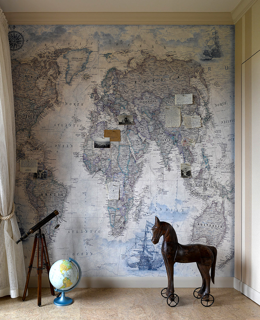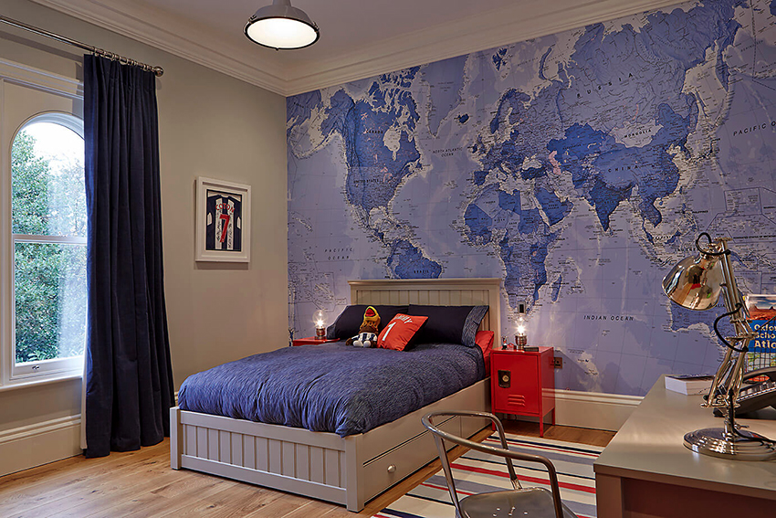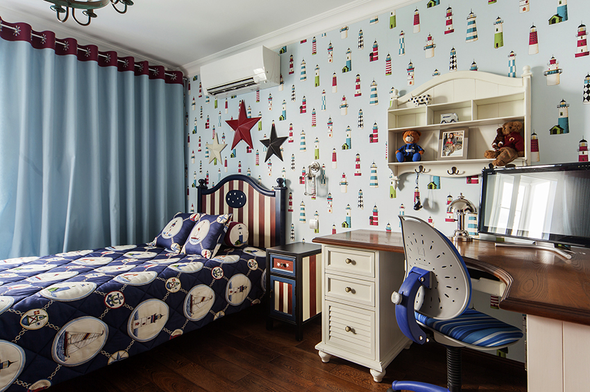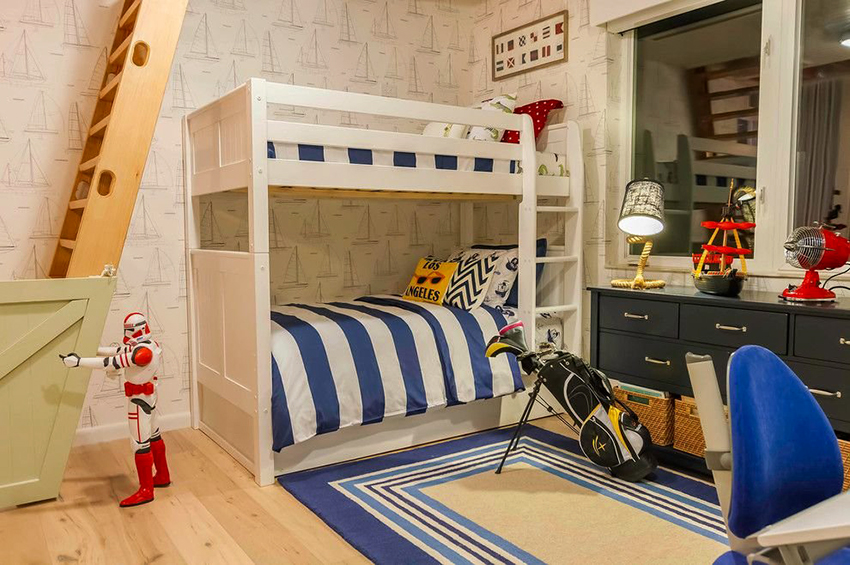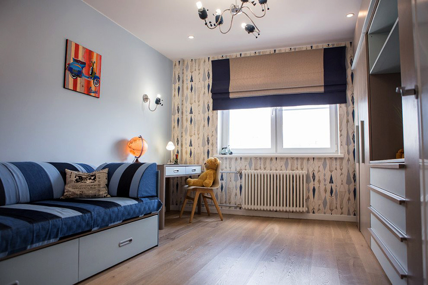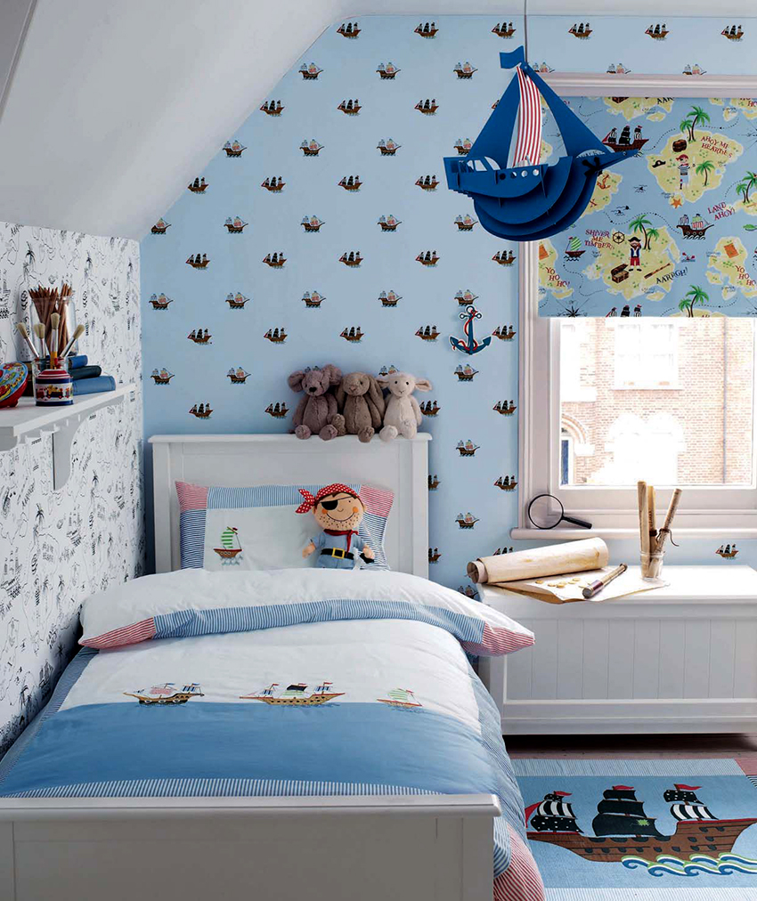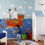 There are separate topics for boys. Many people love nautical design. On the wallpaper for the boy's room, fish, ships, beach landscapes, scenes with sea treasures can be depicted.