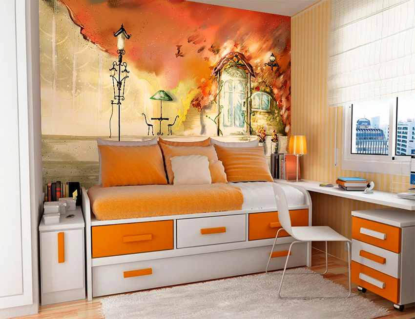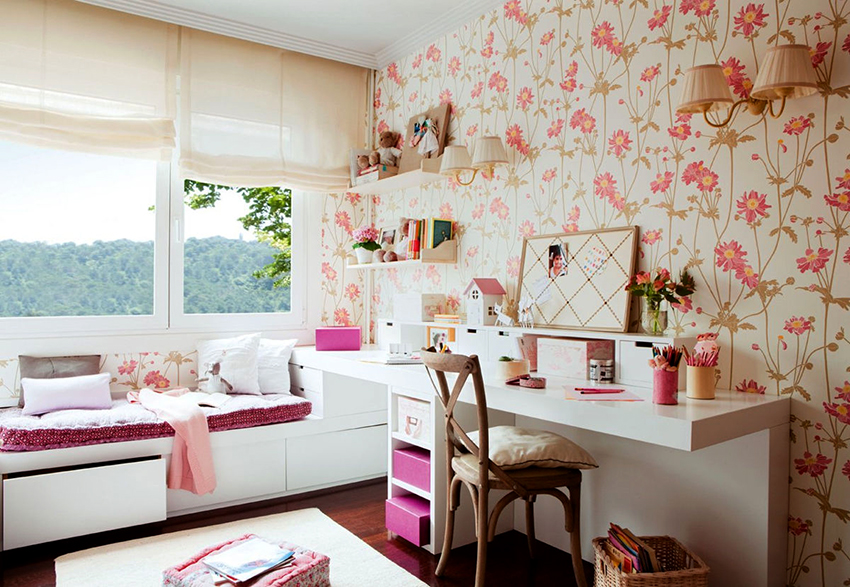 For teenagers, you shouldn't choose the childish options. It is important to focus on personal desires and preferences, with an emphasis on romance, creativity or a girl's hobbies. Beautiful wallpaper-paintings with the image of the streets of Venice and Paris, flowers, hearts or couples in love will do. Photo wallpapers with beautiful girls, photo models look nontrivial.