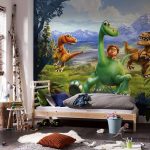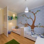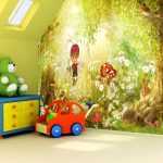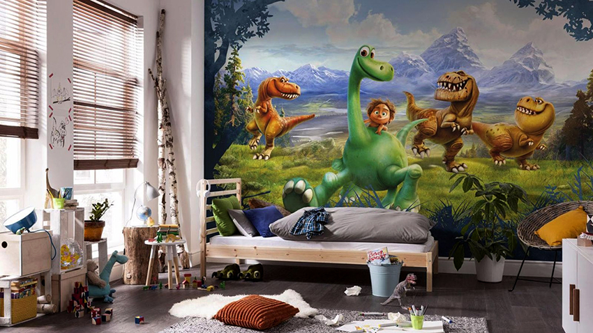 An easy and romantic option that is suitable for girls is products with butterflies or flowers. For boys, you can pick up unusual images on the theme of the animal world. The most relevant and popular option is surfaces with dinosaurs. The room will look original, on one of the walls of which a tree is captured. Such wallpapers can be supplemented with themed stickers with images of animals and flowers, turning the corner into a fairy forest, as shown in the photo of the wallpaper in the room.