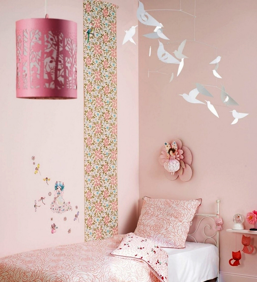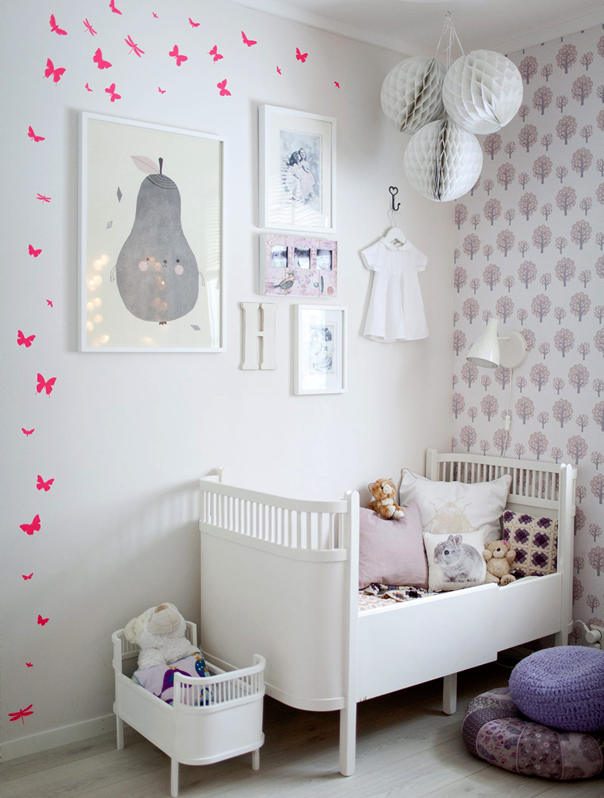 The decoration of the children's room should be oriented towards the age of the child. What a 3 year old will like may not be acceptable to a 10 year old. Wall decoration for a newborn should be done in a calm pastel palette. Bright colors and colorful wallpaper stickers in a nursery with cartoon characters or other images can scare your little one.