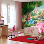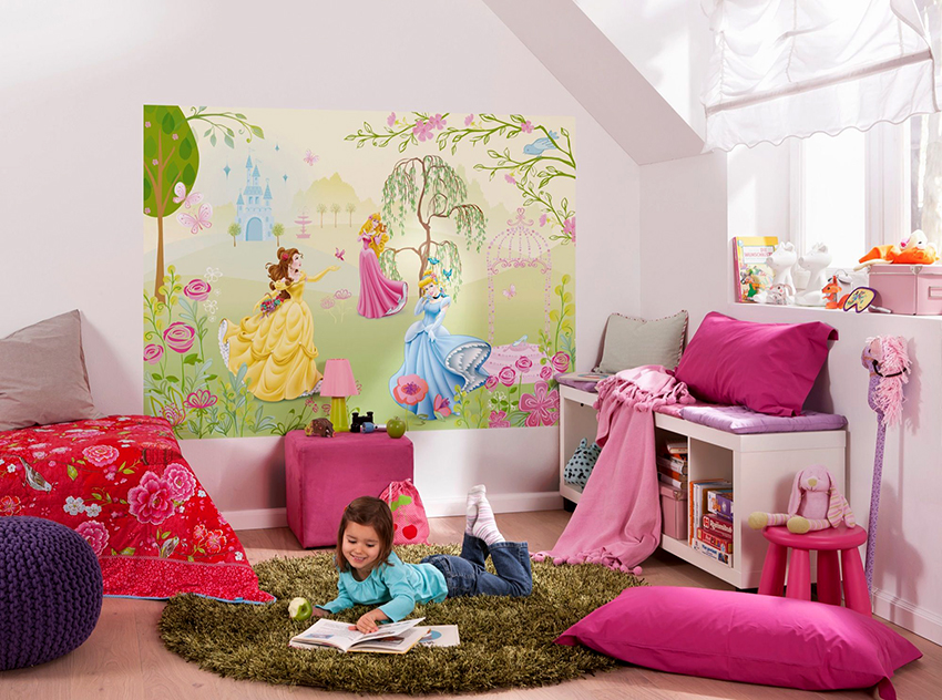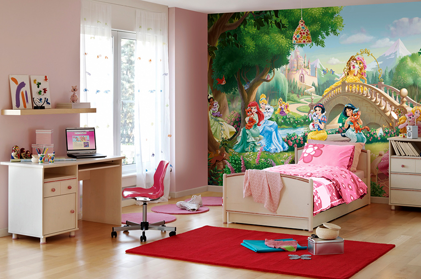 The theme of favorite cartoons is no less popular. There are many options for Disney wallpaper that you can use to paste over all walls or create a bright accent in a room. Girls will love products with princesses, while boys will love products with pirates, robots and superheroes. You can stick wallpaper Cars, canvases with scenes from the cartoons "Madagascar", "Nemo", "Shrek" and others in the children's room.