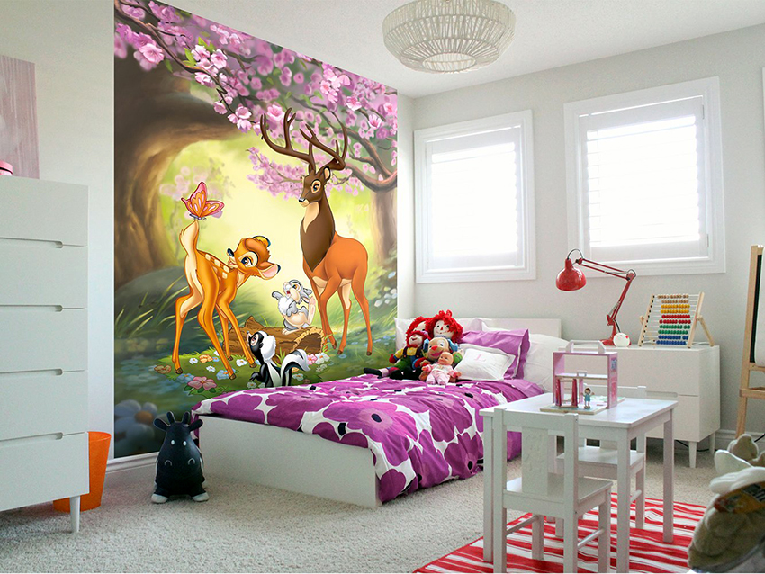 For girls under 3 years old, photo wallpaper should be chosen in a light version, which will have a calming effect on the psychological state of the child and promote restful sleep. Wallpaper with butterflies, stars, cute animals or fairy-tale characters look appropriate. A baby over 3 years old will like brighter options.