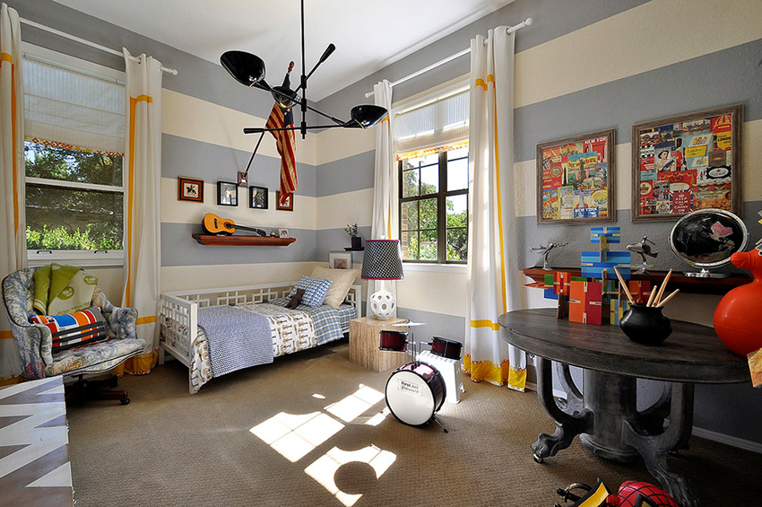 After 6 years of age, the child has friends with whom he actively plays, which can lead to damage to the wall covering. The most justified option in this case is the use of liquid wallpaper, which allows you to quickly correct defects. It is better to choose the decoration in a monochromatic calm design, so as not to unnecessarily overload the child, who is overflowing with information during this period. Psychologists advise covering the walls with striped wallpaper with a pattern in the nursery, which will allow the baby to concentrate.