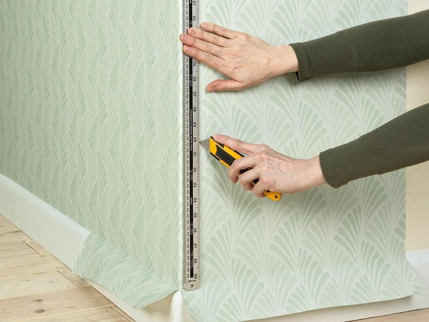Important! Due to the quality of vinyl wallpaper, some craftsmen do not cut them in advance, but stick them straight from the roll. A small overlap is made on the ceiling, which is later cut off with a construction knife, and the bottom is trimmed along the plinth.