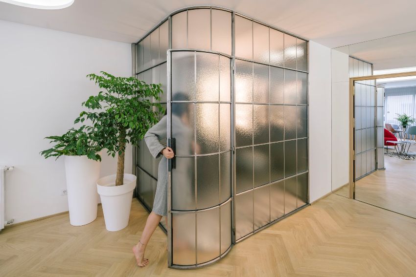 The organization of the office workspace in the coworking style is gaining popularity. With such a layout, excellent sound insulation properties should be noted. glass doors and partitions. Most often, coworking involves the neighborhood of completely different areas of professional activity. This increases the productivity of employees and encourages intense communication between colleagues. Thanks to good sound insulation, people working in separate boxes on different projects will not interfere with each other.