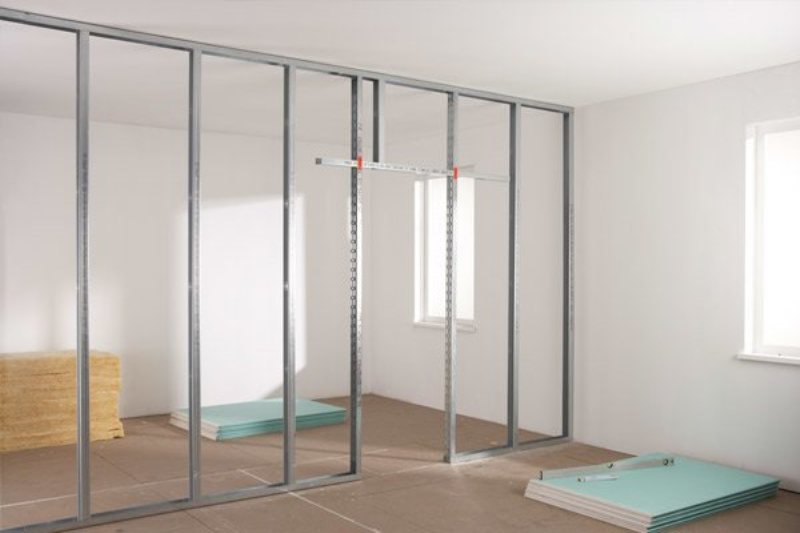 In order to build a partition, we first need to make a rigid frame. To make it, you will need a 75 mm galvanized profile with additional elements and wooden blocks. They will be needed to make the frame stronger in some places. We will sheathe the frame with sheets of plasterboard with a thickness of 12.5 mm of a standard size using self-tapping screws.