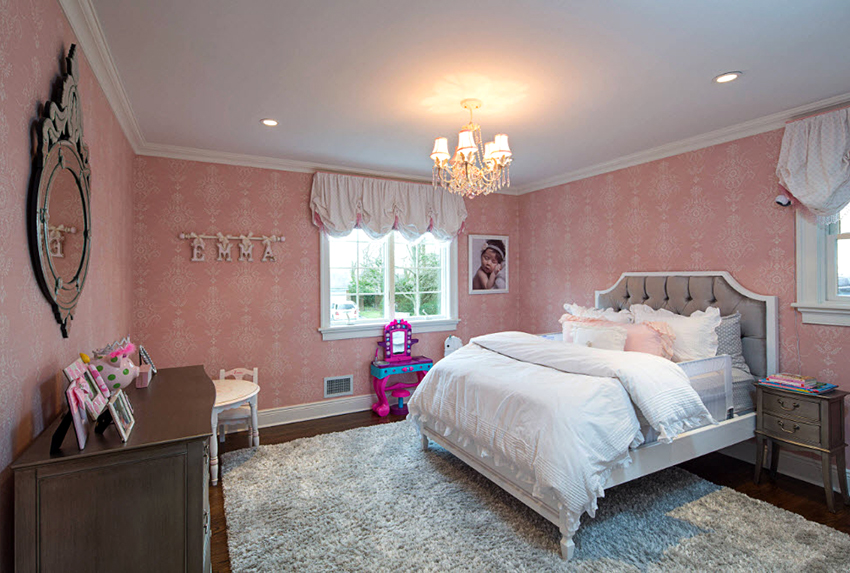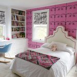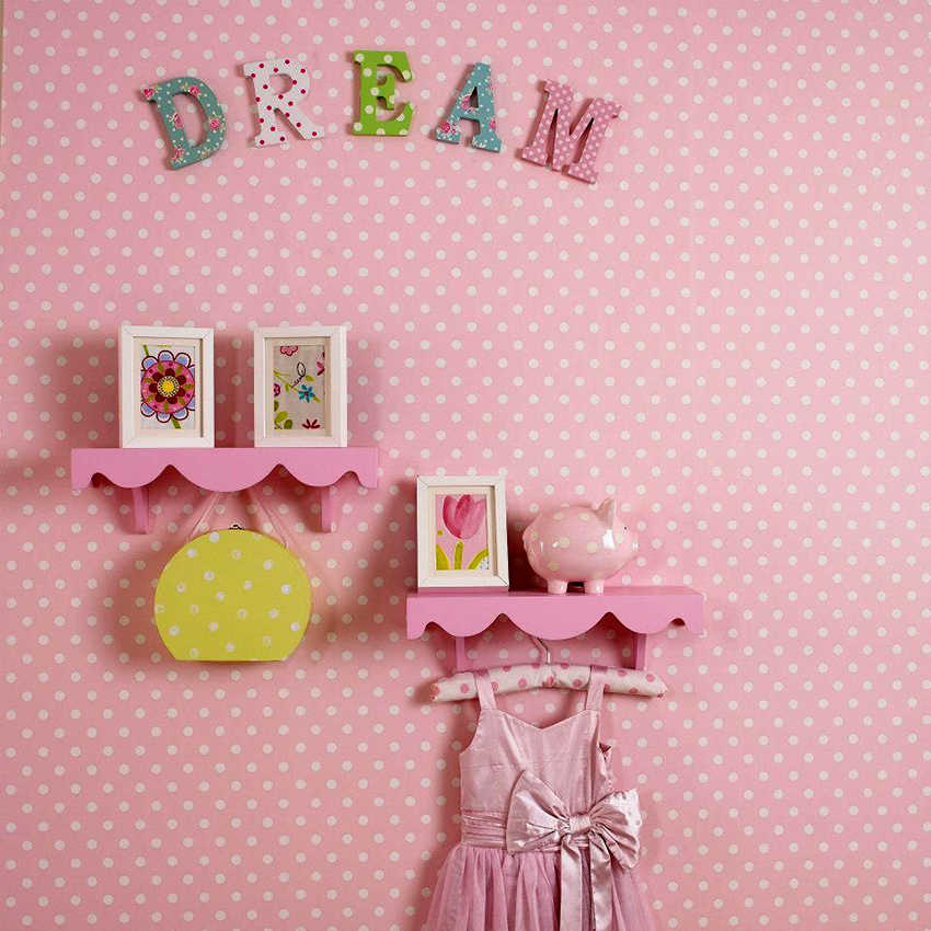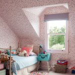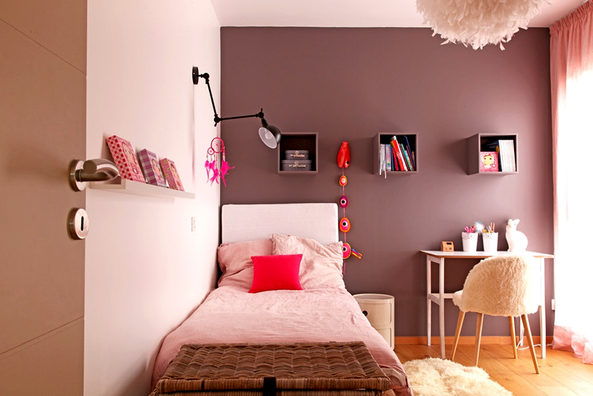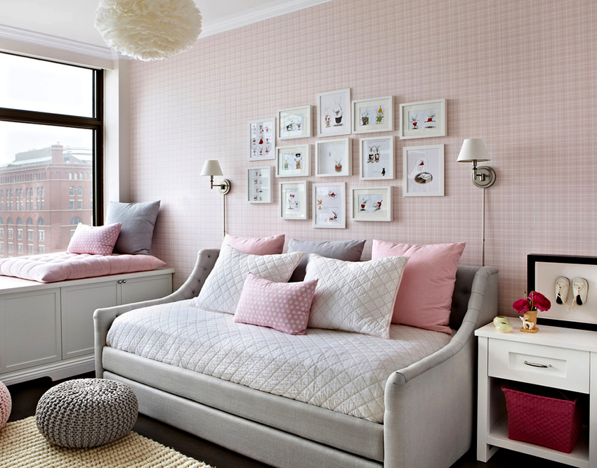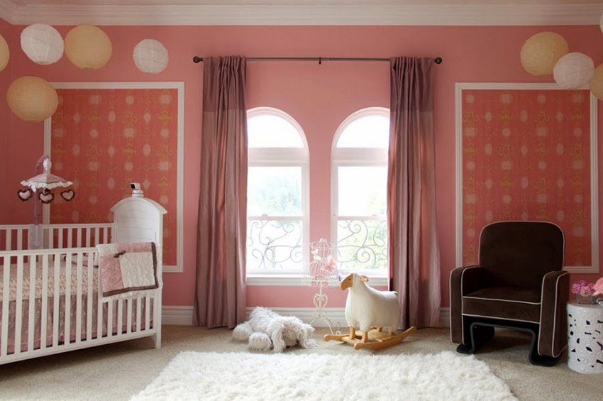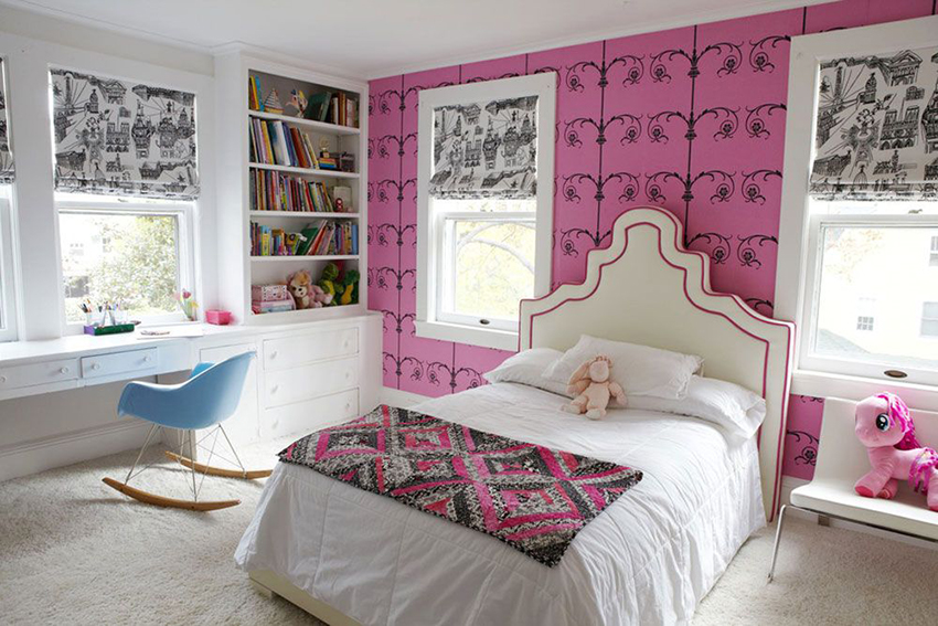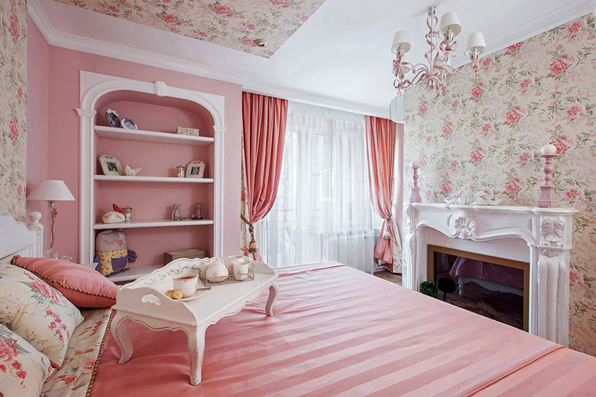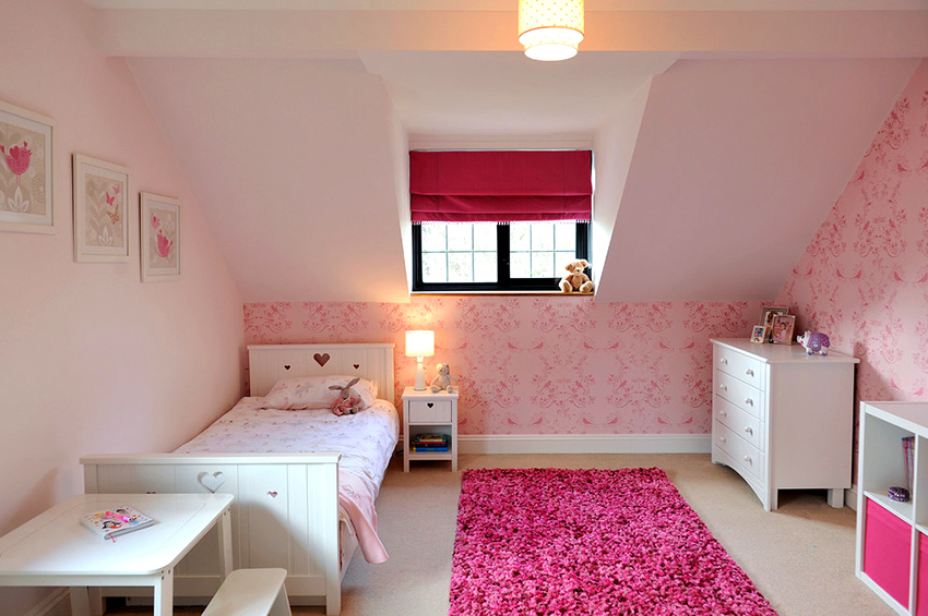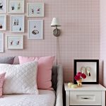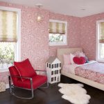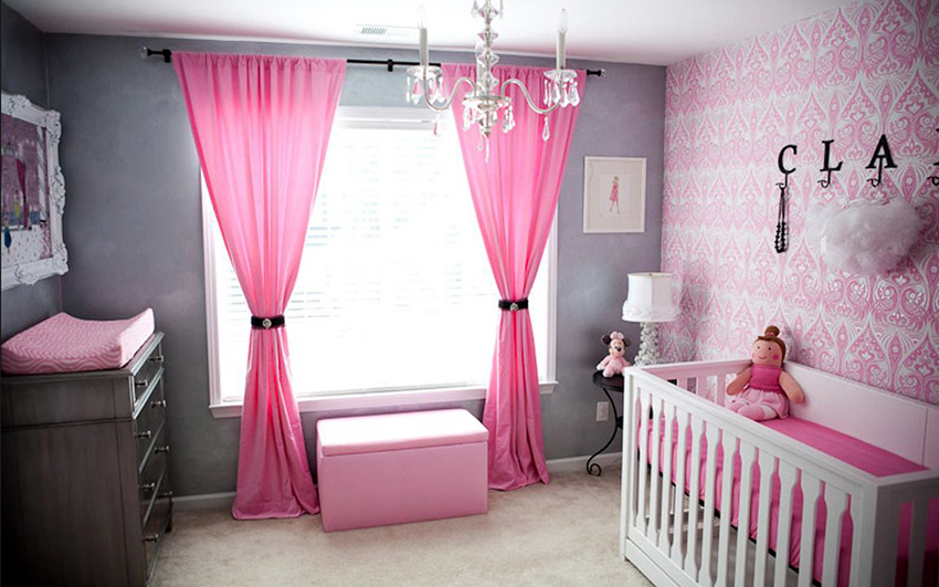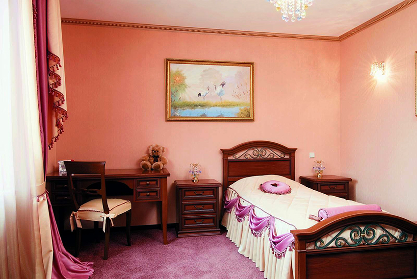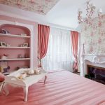 The most organic design idea will look with a monochromatic room decoration with cute pink wallpaper. In small spaces, soft, calm pastel shades are preferred. A more expressive tone or any pattern on the coating will visually reduce the size of the room. In spacious rooms, you can use richer and brighter colors. Such a background should be diluted with light furniture and textiles.