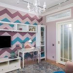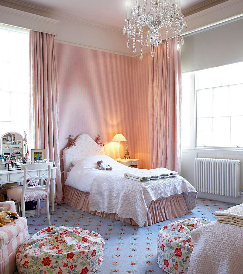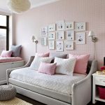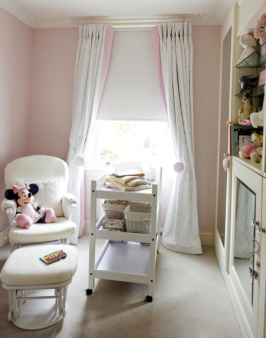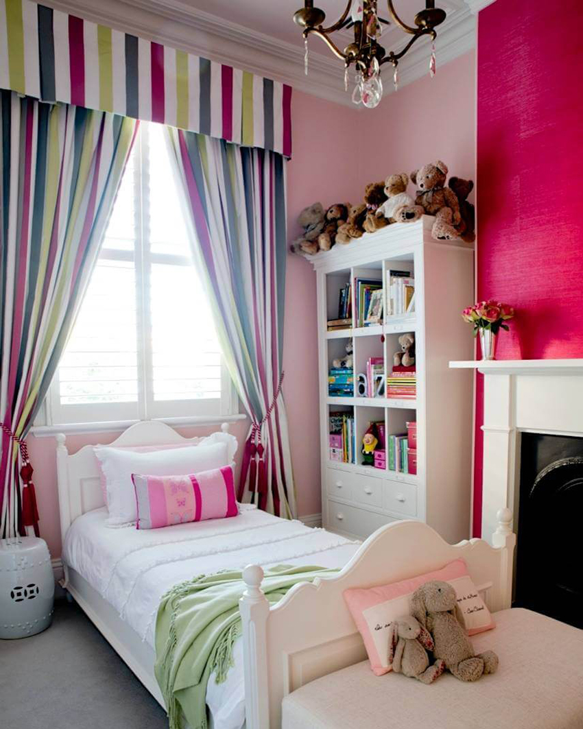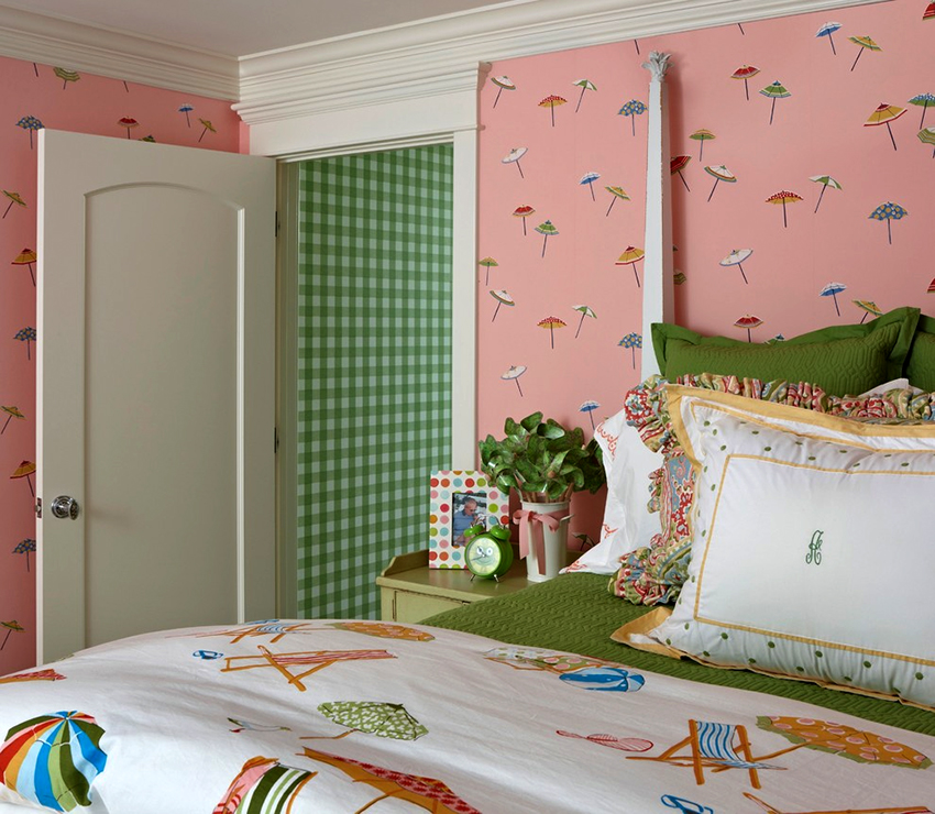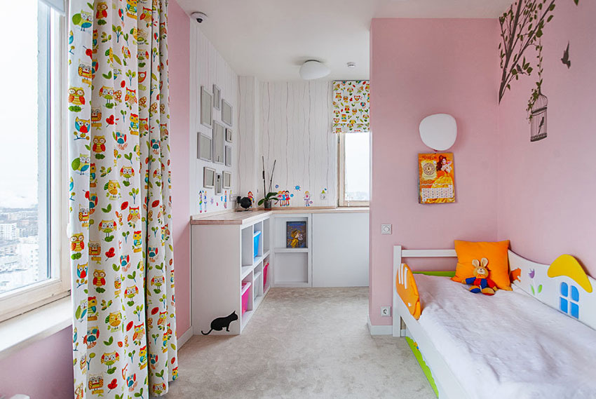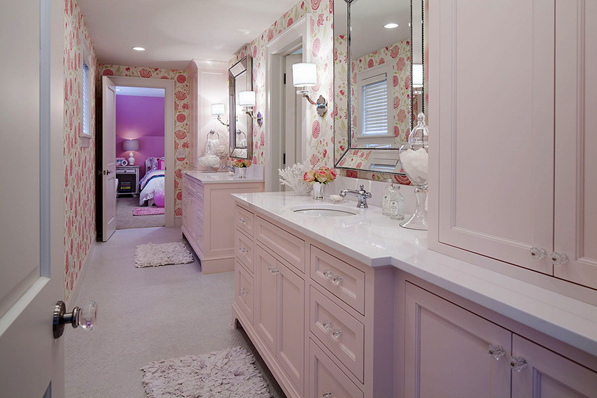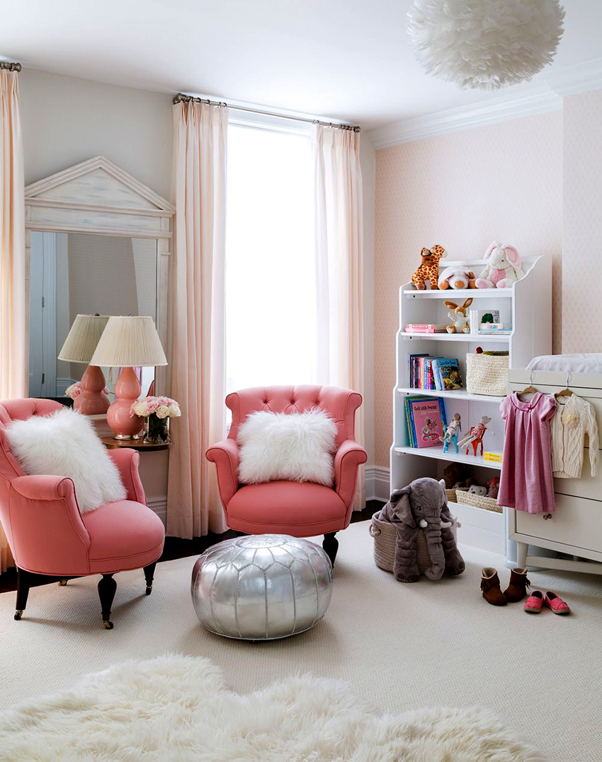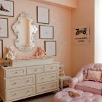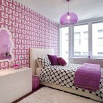 The most organic design idea will look with a monochromatic room decoration with cute pink wallpaper. In small spaces, soft, calm pastel shades are preferred. A more expressive tone or any pattern on the coating will visually reduce the size of the room. In spacious rooms, you can use richer and brighter colors. Such a background should be diluted with light furniture and textiles.