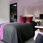 Pink color harmoniously combines with gray wallpaper in the room. In this design, mirrors, forged pieces of furniture and silver inserts will look appropriate. Plain gray-pink wallpaper will fill the atmosphere with calmness and harmony. The nobility and casual playfulness of the setting will add bright red or orange colors.