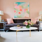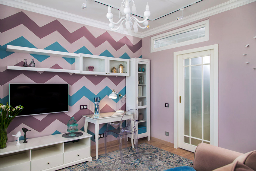 A pleasant and cozy interior in the living room can be created using muted shades of pink. Against this background, white or gray furniture looks most advantageous, which will give the room a special flavor. Brown and black decorative elements will also help to play up the velvety and softness of the pink hue. The accent wall trimmed with pink wallpaper, which stands out against the general light pastel background, looks elegant and modern.