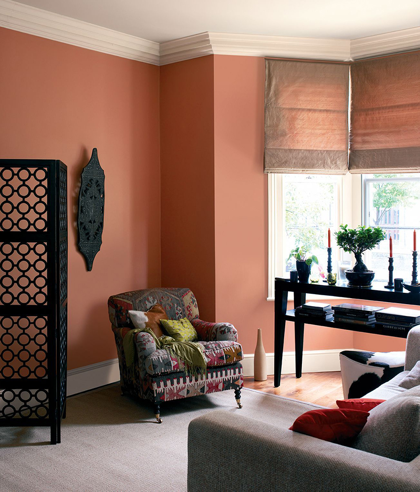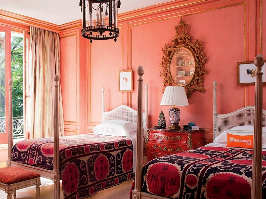 Explosive and intense interiors can be achieved by interplaying pink and orange wall backgrounds with other colors such as green, vibrant purple, blue, and yellow, which are reflected in textiles or furniture upholstery. However, such a combination is advisable to use in spacious rooms.