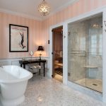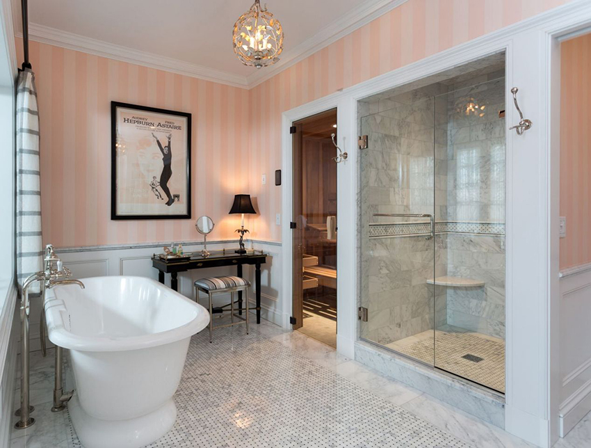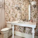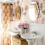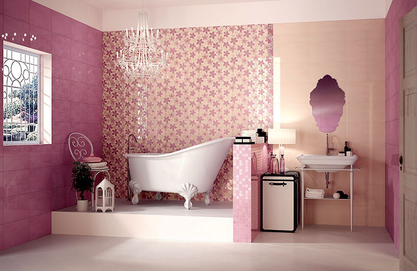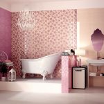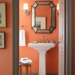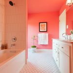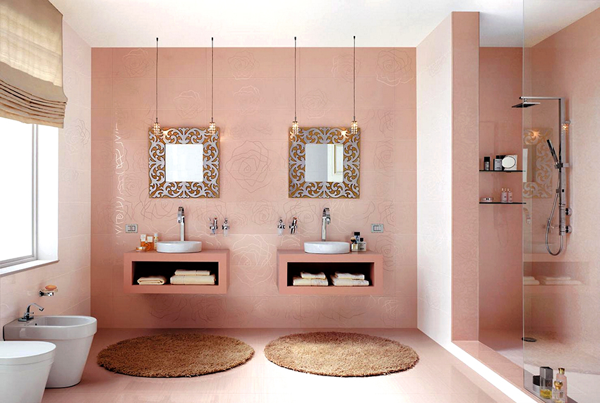 For bathroom decoration, peach color will be the best solution, which will make the interior cool and fresh. Combining it with orange details will help bring a touch of warmth and comfort. This shade will shine in the mirror, emphasizing the radiant and healthy appearance of a person who is peering into his reflection. Also, a good solution would be to combine pink wallpaper for walls with textured white tiles, decorated with separate large patterns.