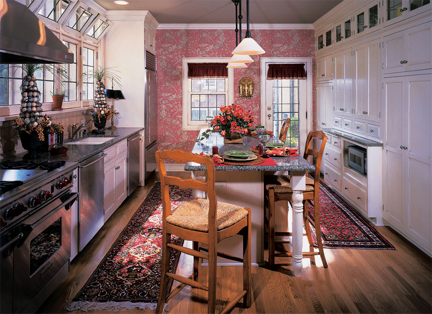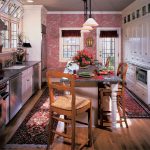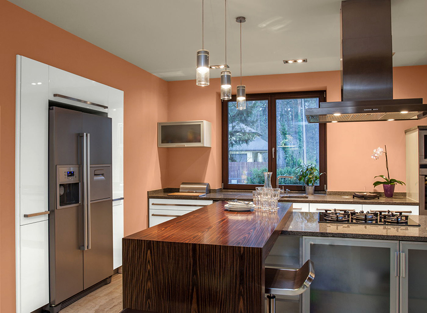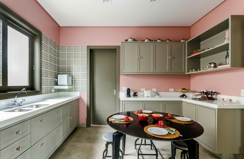 Warm pink tone improves appetite. However, you should not overload the kitchen space with rich marshmallow shades, as this can lead to a passion for sweets and lead to weight gain. The best solution is a muted soft pink tint of the wallpaper, which will awaken the creativity of the young hostess and push her to new culinary feats. The pink background of the walls can be complemented with stencil contrasting inserts in white, blue, orange or green.