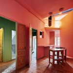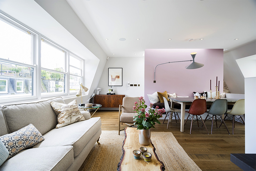 Original yet organic interiors with pink wallpaper