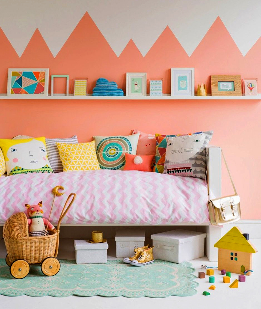 A good result is a combination of pink or peach with yellow, which is ideal for a nursery.In a teenager's room, these shades can be used against a blue background, which will give the atmosphere a creativity and youthful character. The tandem of red and pink colors will bring passion and femininity to the bedroom. A strict and restrained interior will be obtained by combining a black tone with peach-colored fragments.