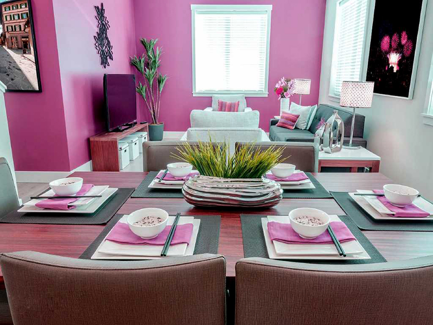 The accent color is juicy crimson, which looks best in combination with white. Aristocratic natures will love the dirty pink hue, which is harmoniously complemented by glass and gilded elements. The interior decoration will be a purple hue, which brings refined chic and nobility to the interior.