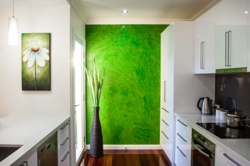 First of all, requirements are imposed on the wall covering of the kitchen not to absorb extraneous odors, as well as moisture. Secondly, it must tolerate washing and cleaning well, and at the same time not lose its color and appearance. And of course, the coating must be resistant to high temperatures, since this cannot be avoided in the kitchen. Venetian plaster with the addition of additional components to the mixture satisfies all these requirements.