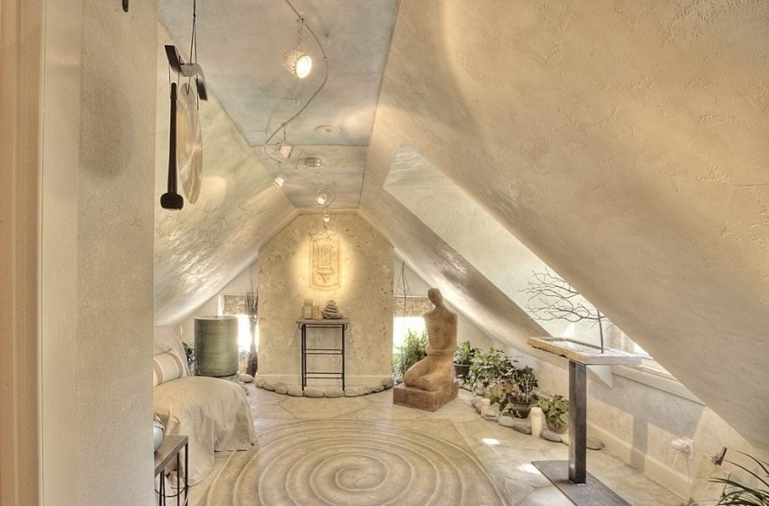 Another unusual application of the texture of Venetian plaster is a stretch ceiling. Photos of interiors using this type of ceiling covering appeared not so long ago and have not yet had time to gain widespread popularity. However, it is impossible to deny the beauty and sophistication of such a solution, especially when it comes to decorating the living room.