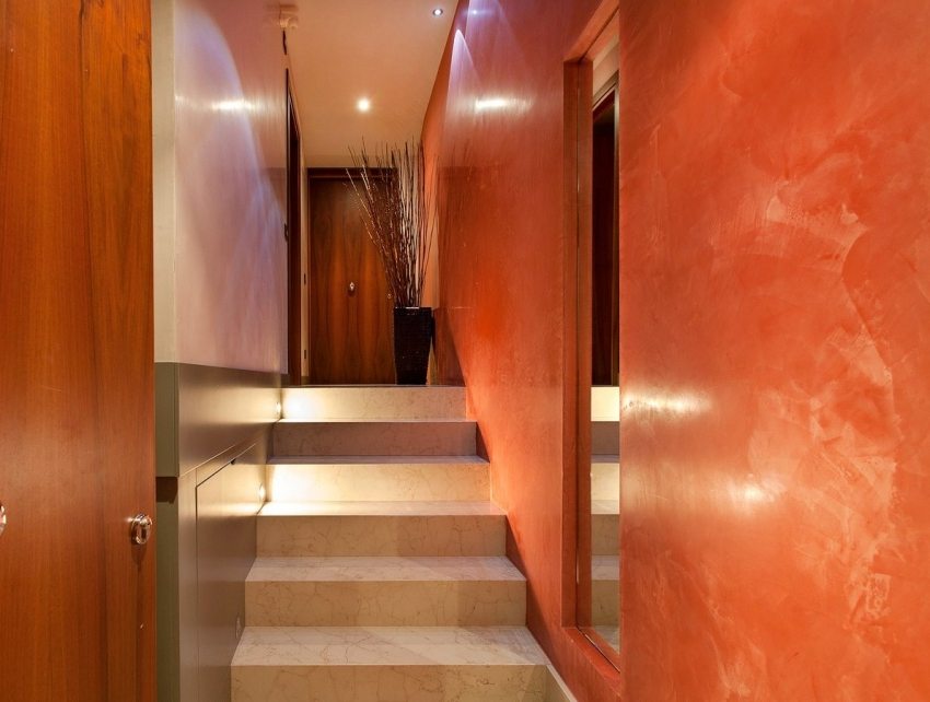 Venetian plaster is a great way to decorate the interior of the corridor and add a certain charm to it. Often in private houses where the hallway is not fenced partitions and goes to the hall or staircase hall to the second floor, the same design style is used for all combined rooms. An interesting design technique is when a reproduction of a painting is divided into several fragments, each of which is applied to the walls of different rooms. The whole picture can be seen by moving, for example, from the hall to the living room.