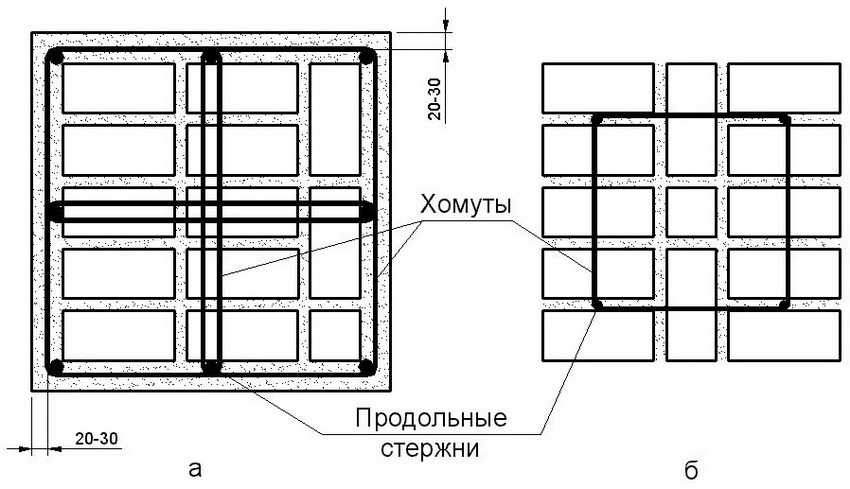Longitudinal reinforcement of masonry: a - external arrangement of rods, b - internal arrangement of rods