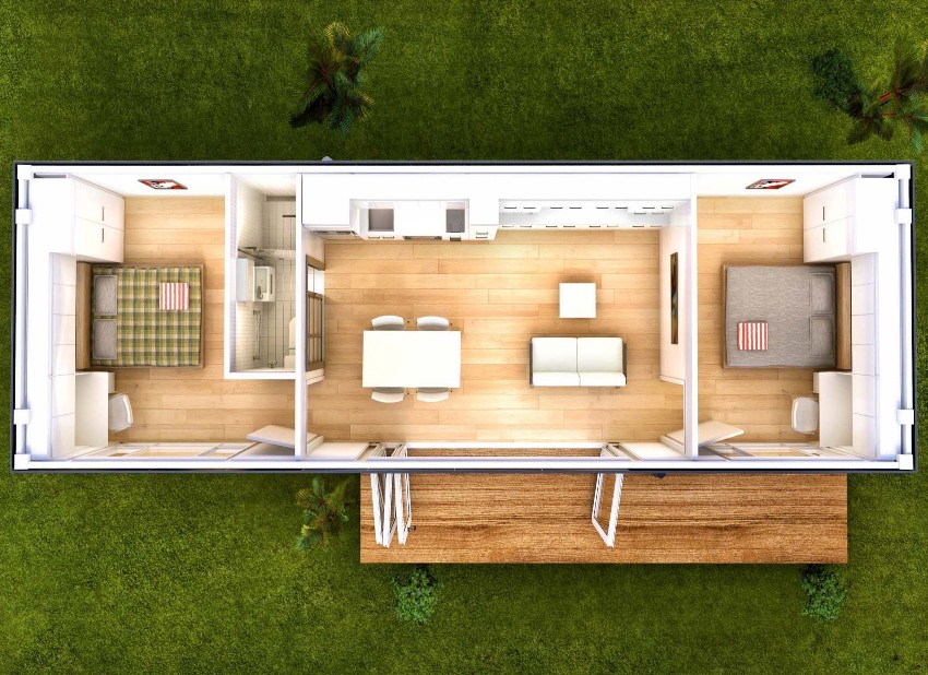 Depending on how many containers will be used to build a house, and how they will be placed in relation to each other, you can get rooms with different layouts and areas. Most often, developers resort to the option where several containers are installed in a row under one roof. In this case, the modules are adjacent to each other with the long side. With this arrangement, the rooms are connected by organizing internal openings.