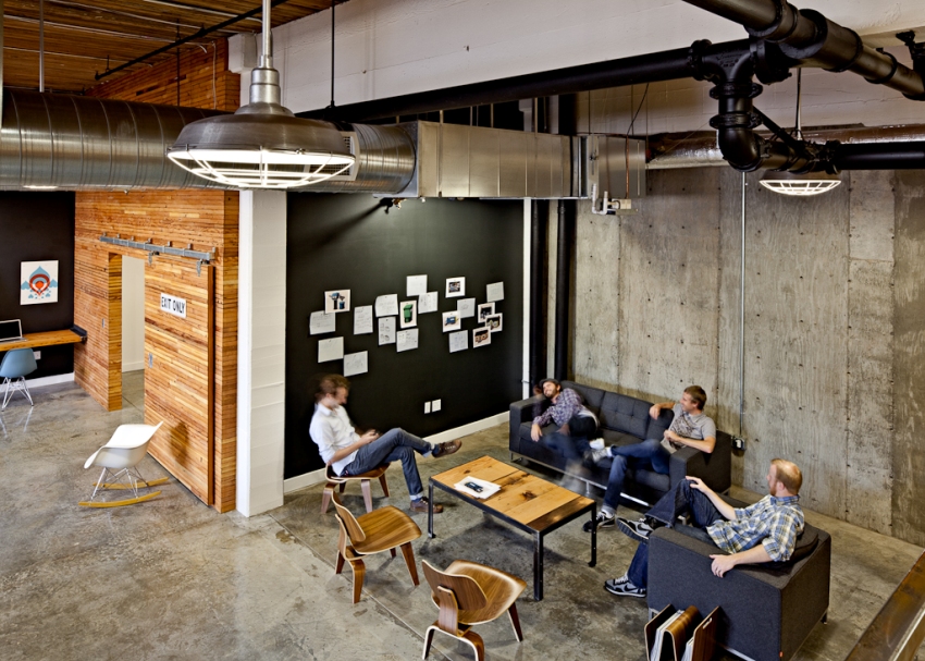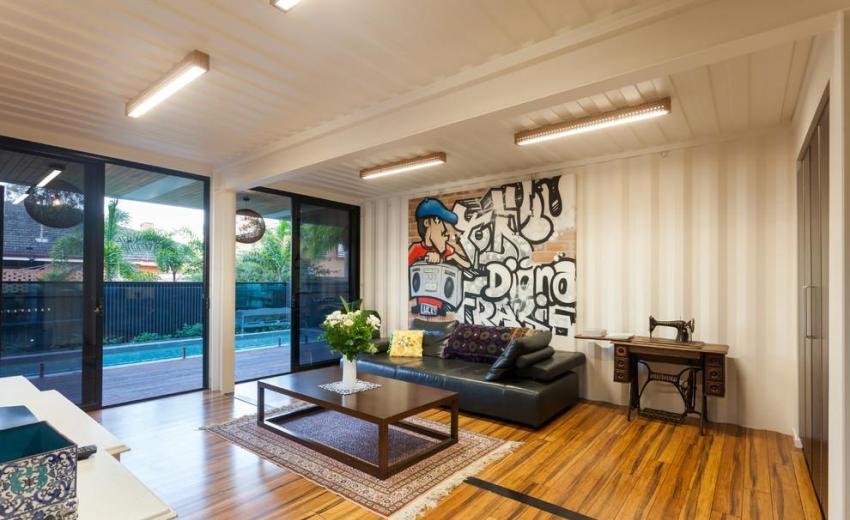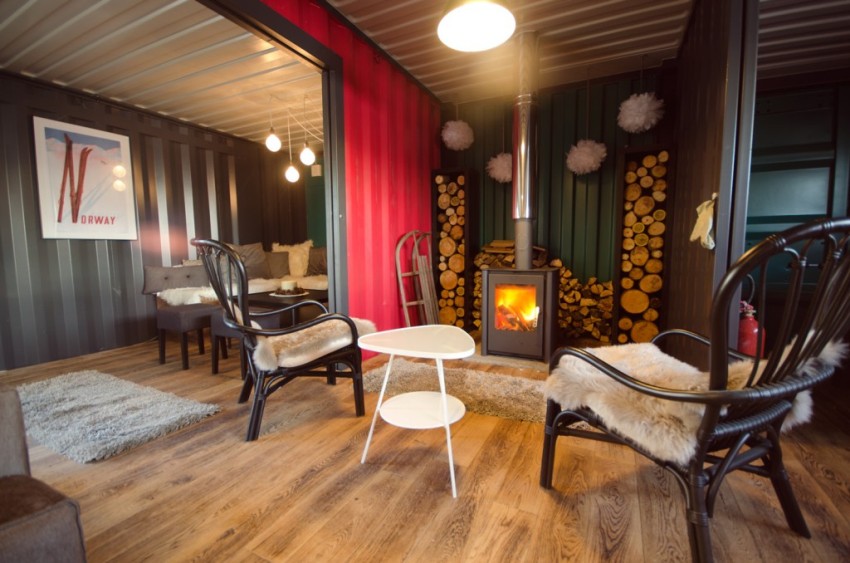 The interior of the container house combines modern finishing materials and non-trimmed block elements.