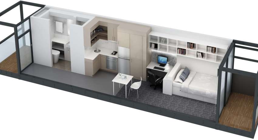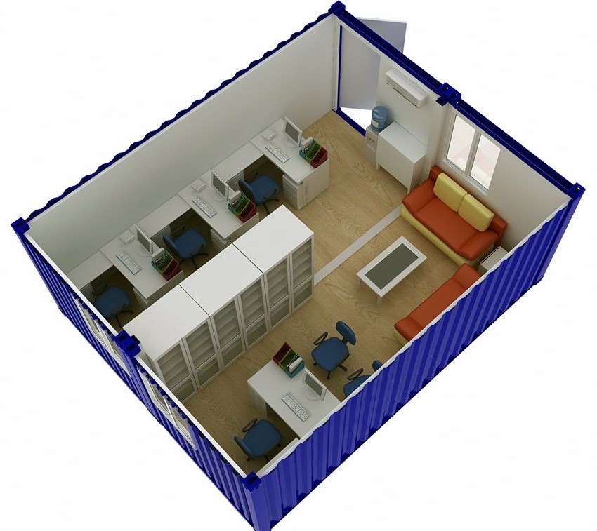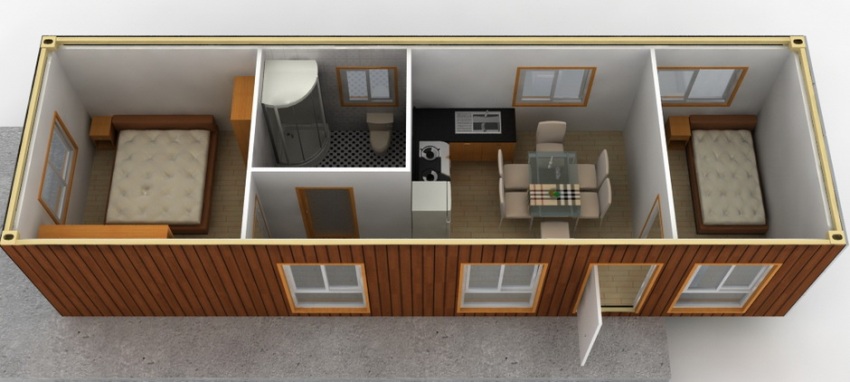 Typically 40 feet of standard size shipping containers are used for building construction. The internal dimensions of such a structure are 2.4x12x2.35 m. One container will be enough to create: