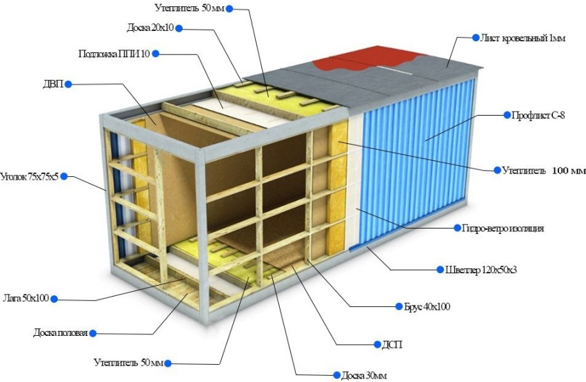The walls of containers must be insulated, sheathed with sheets of drywall or plywood, and then painted, revetted with clapboard or any other finishing material