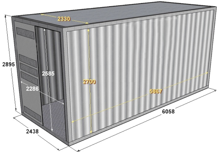 The internal dimensions of the 20 t container are 2.33x5.86x2.19 m. Having similar dimensions, the structure has a useful volume of 29.5 m³. Excluding the space allocated for the installation of cladding and insulation, this will be the approximate size of the interior space of the room.