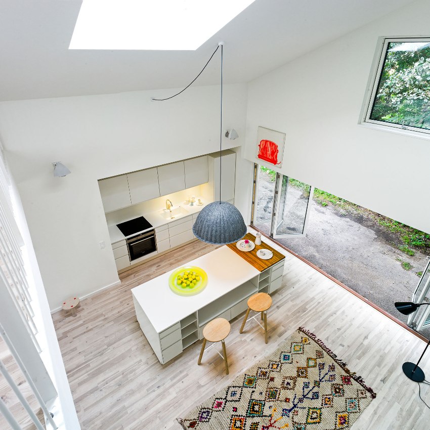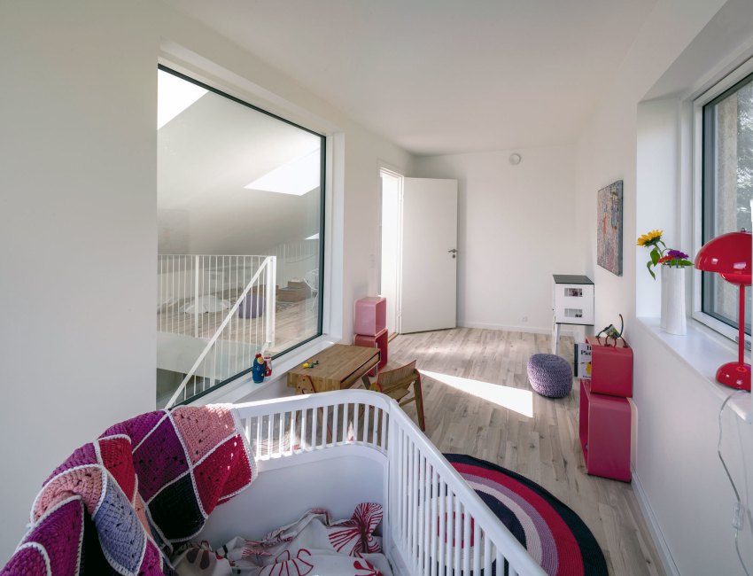 According to the idea, a kind of "house within a house" is created.For this, individual smaller components are placed inside the massive structure, which can be used as independent full-fledged buildings. Thanks to the large sliding glass doors, the living space can be harmoniously combined with the outside world.