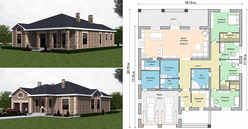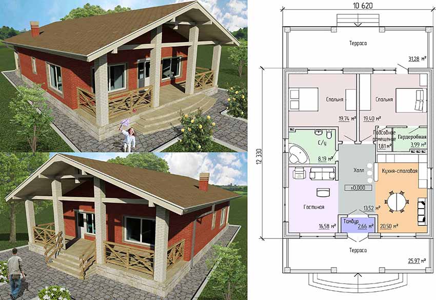 In addition to wooden buildings, houses made of foam blocks, ceramic blocks are also offered. A small building of foam blocks of one and a half floors (with an attic) with an area of 110 m², covered with metal tiles, without a garage is offered for 1.5 million rubles, the project - for 17 thousand rubles. A house made of ceramic blocks with an area of 130 m², with a metal roof covering, on a strip foundation, with a garage will cost 3.5 million rubles. The cost of the project is 24 thousand rubles.